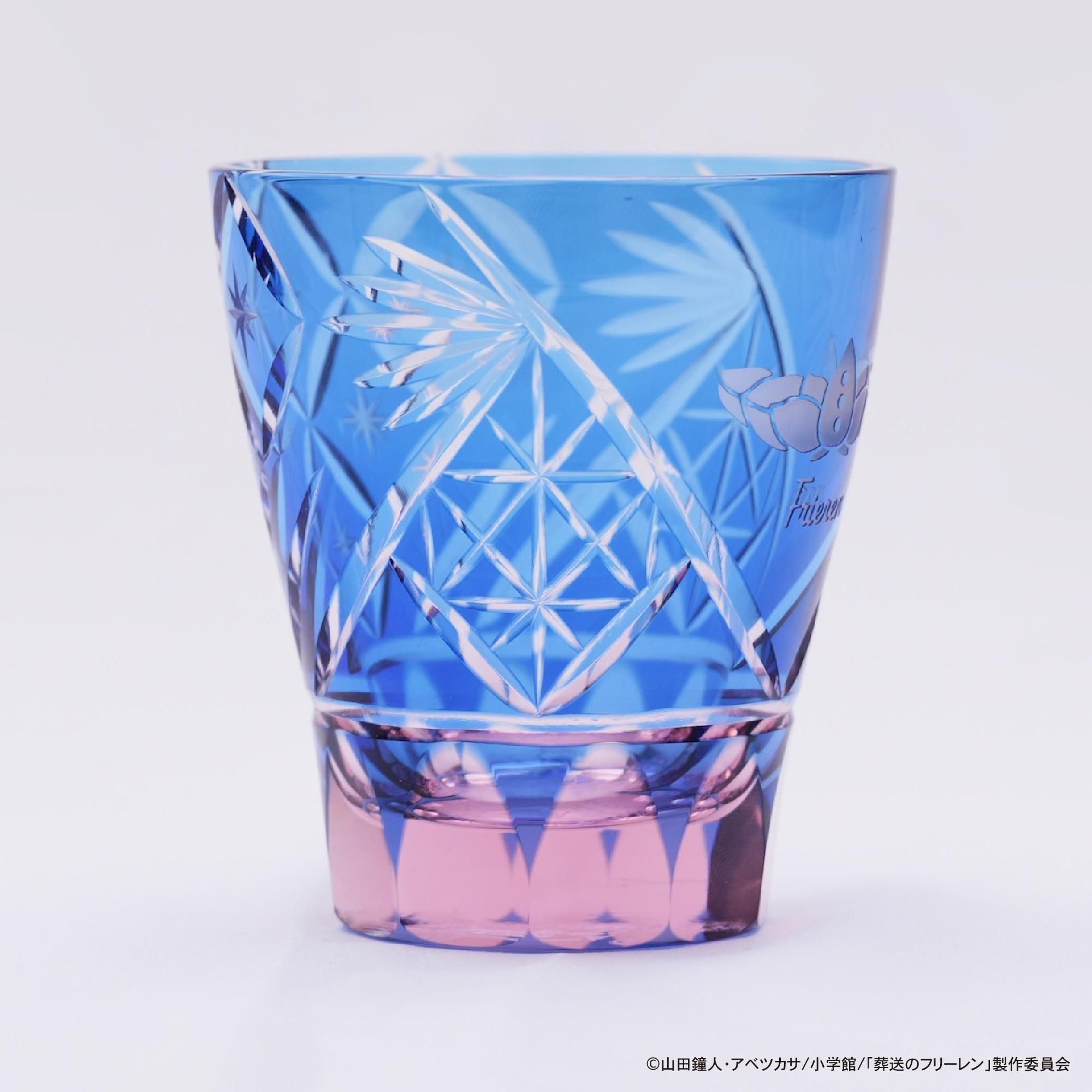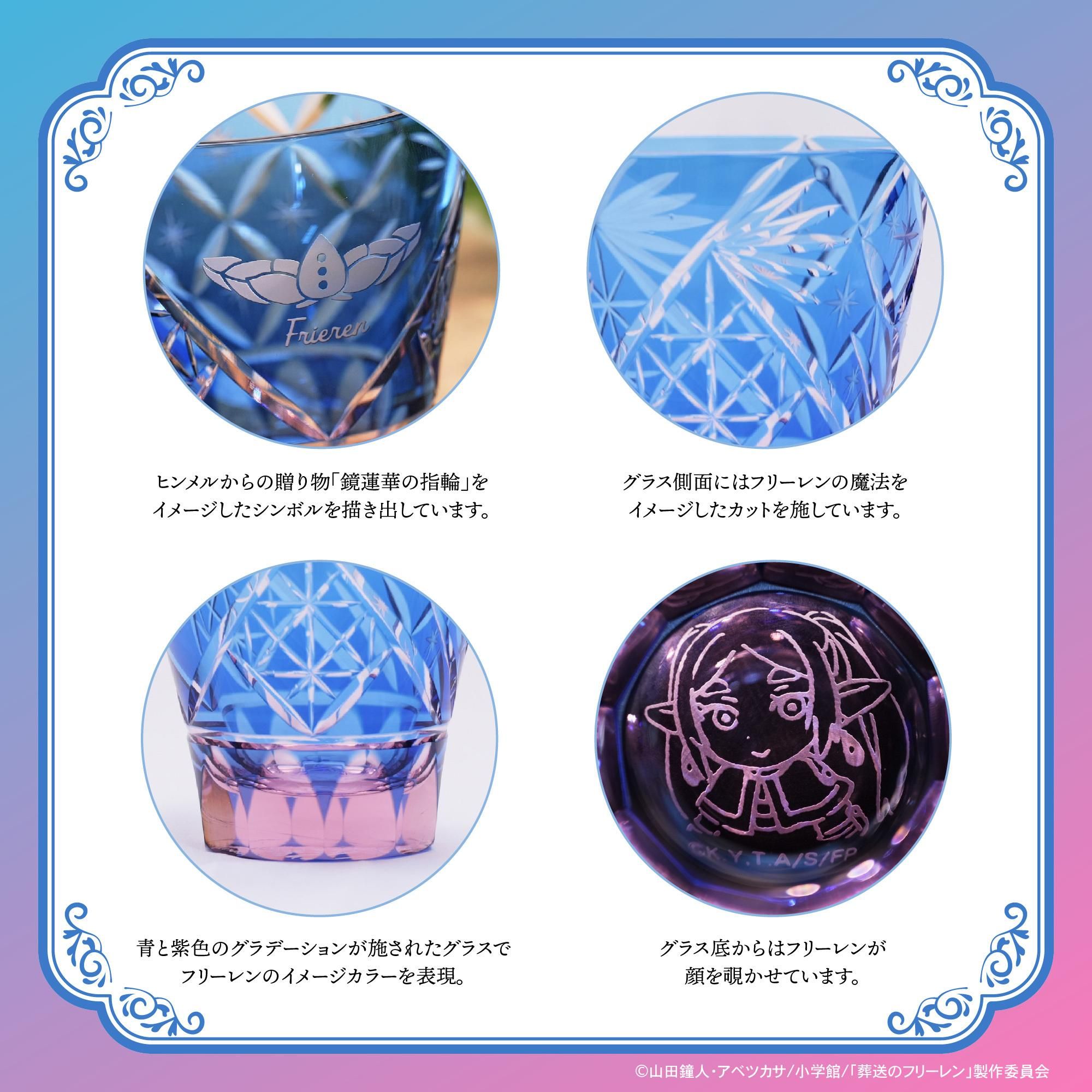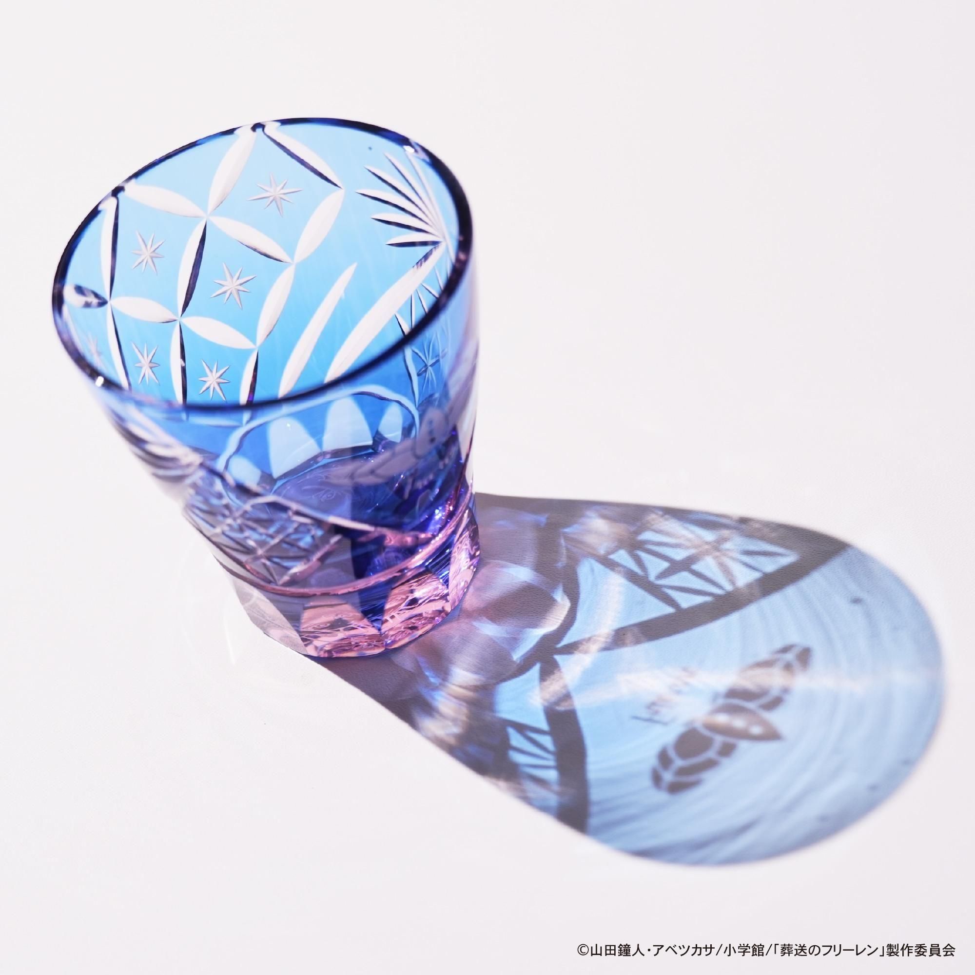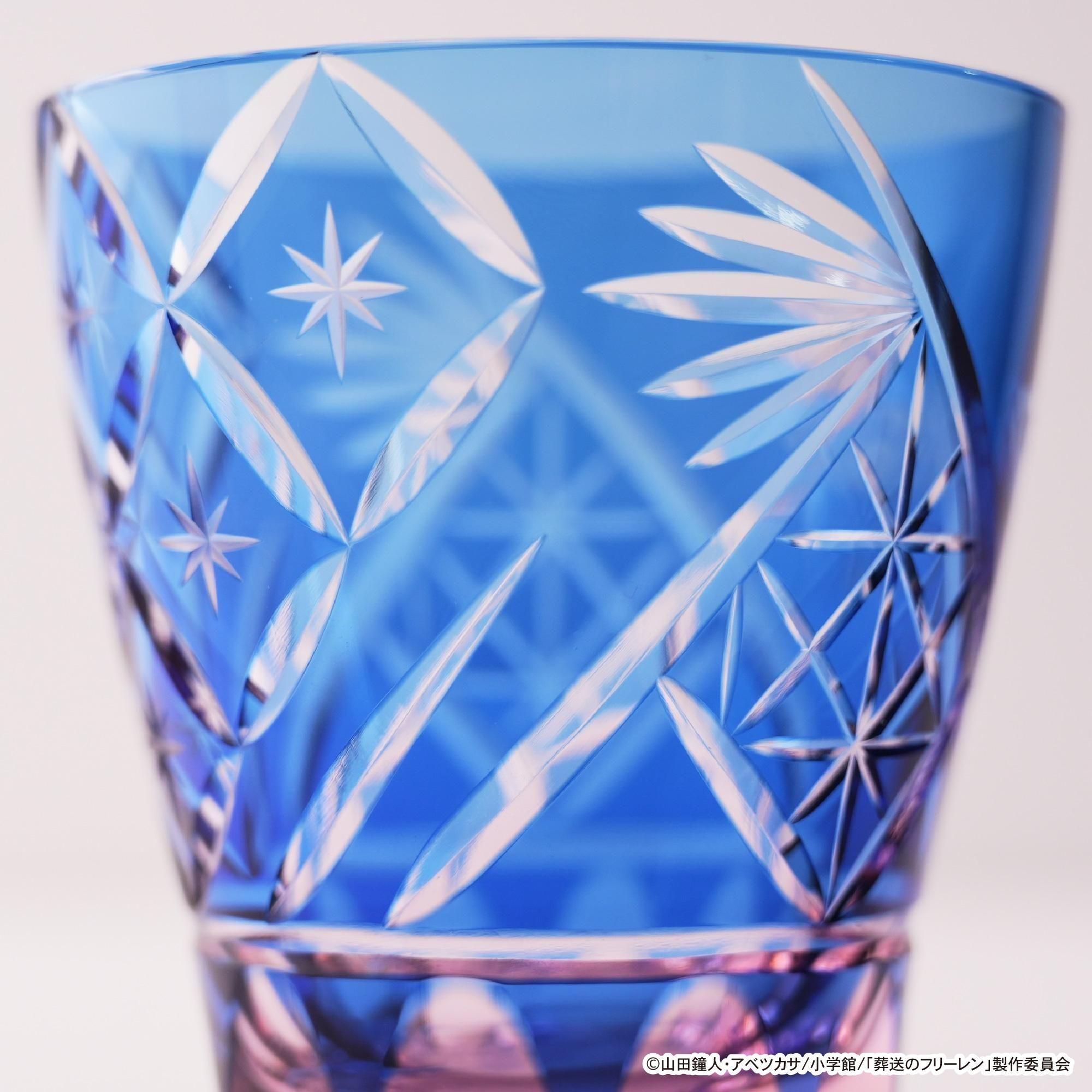 『葬送のフリーレン』の世界観を、江戸切子ならではの繊細なカットで表現しました。青と紫色のグラデーションが施されたグラスは、フリーレンのイメージカラーを表現していて、魔法をイメージしたカットが光を受けてきらめき、グラス底にはサンドブラストで描かれたフリーレンが顔を覗かせています。さらに、正面にはサンドブラスト加工によってヒンメルからの贈り物「鏡蓮華の指輪」をイメージしたシンボルを描き出し、幻想的でありながら凛とした存在感を持たせています。