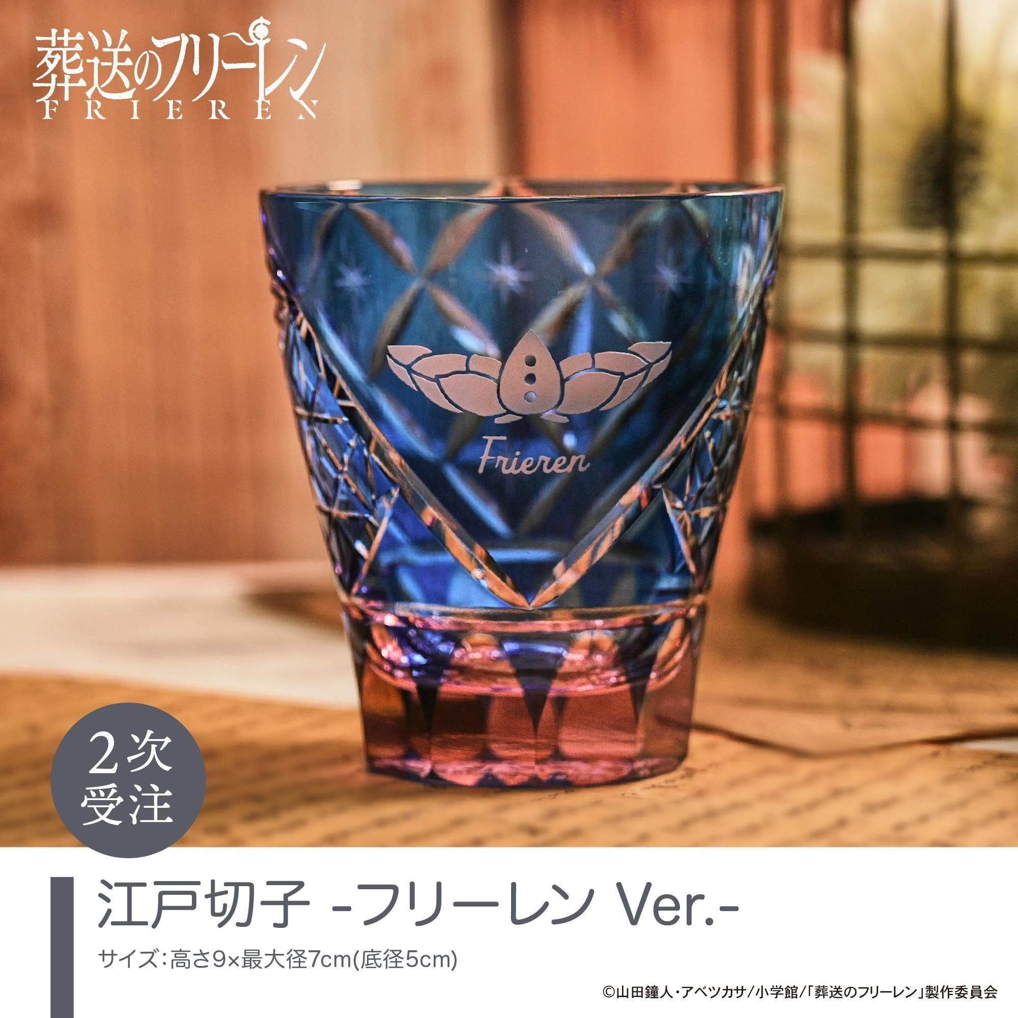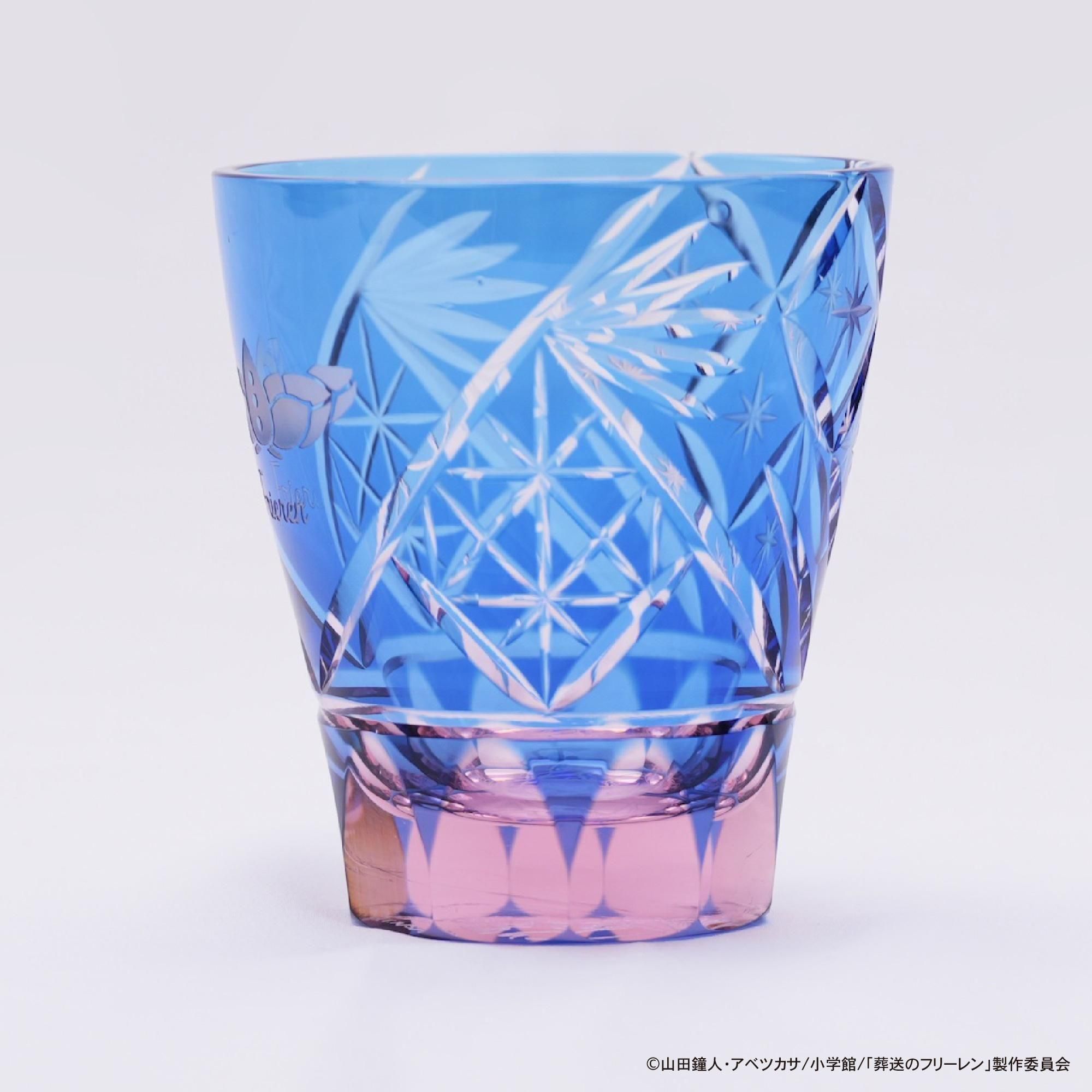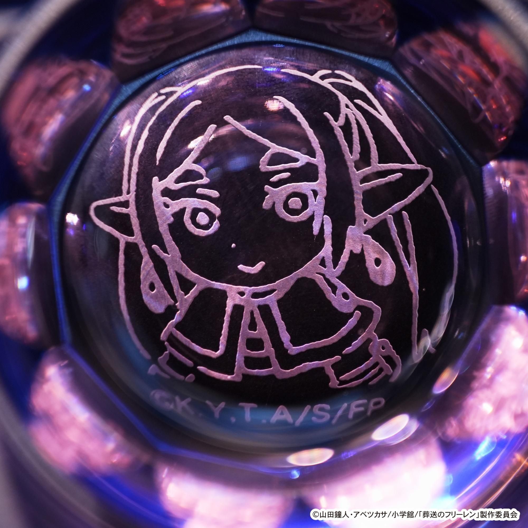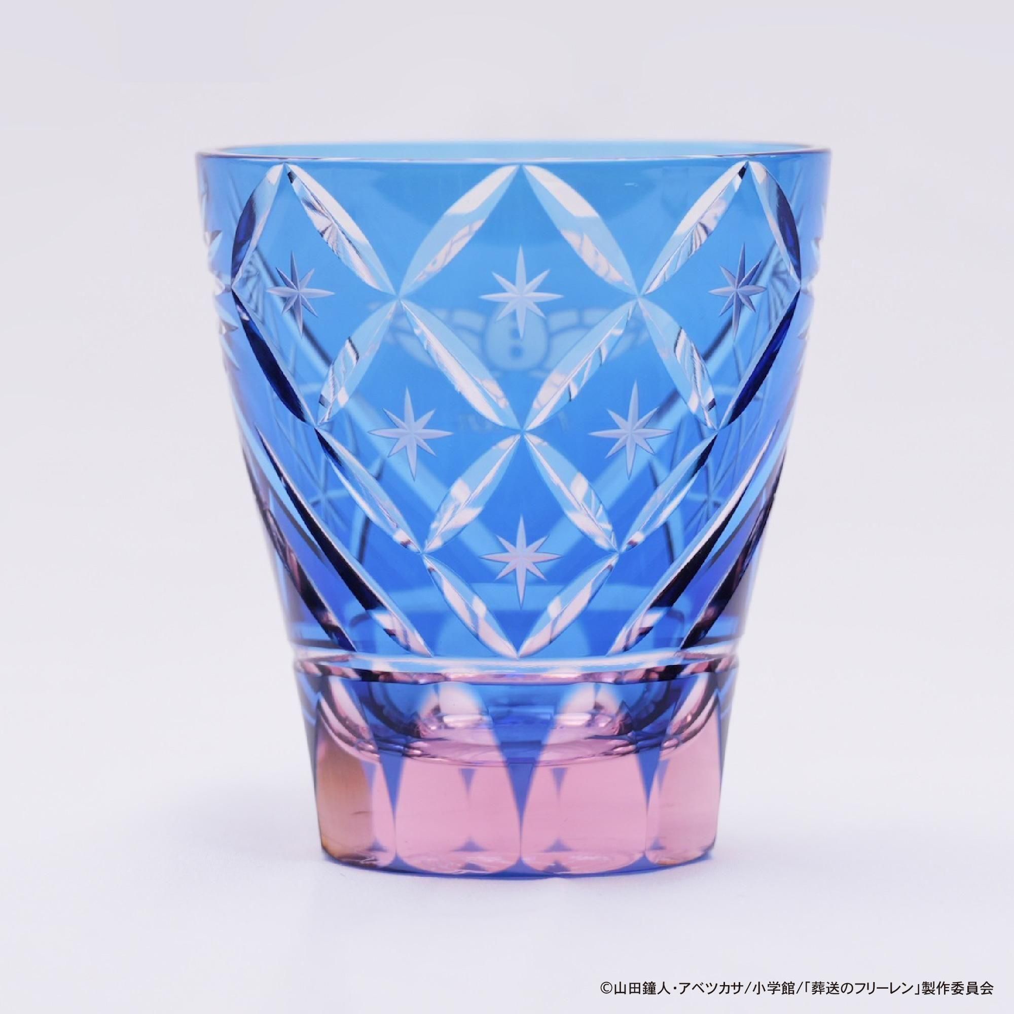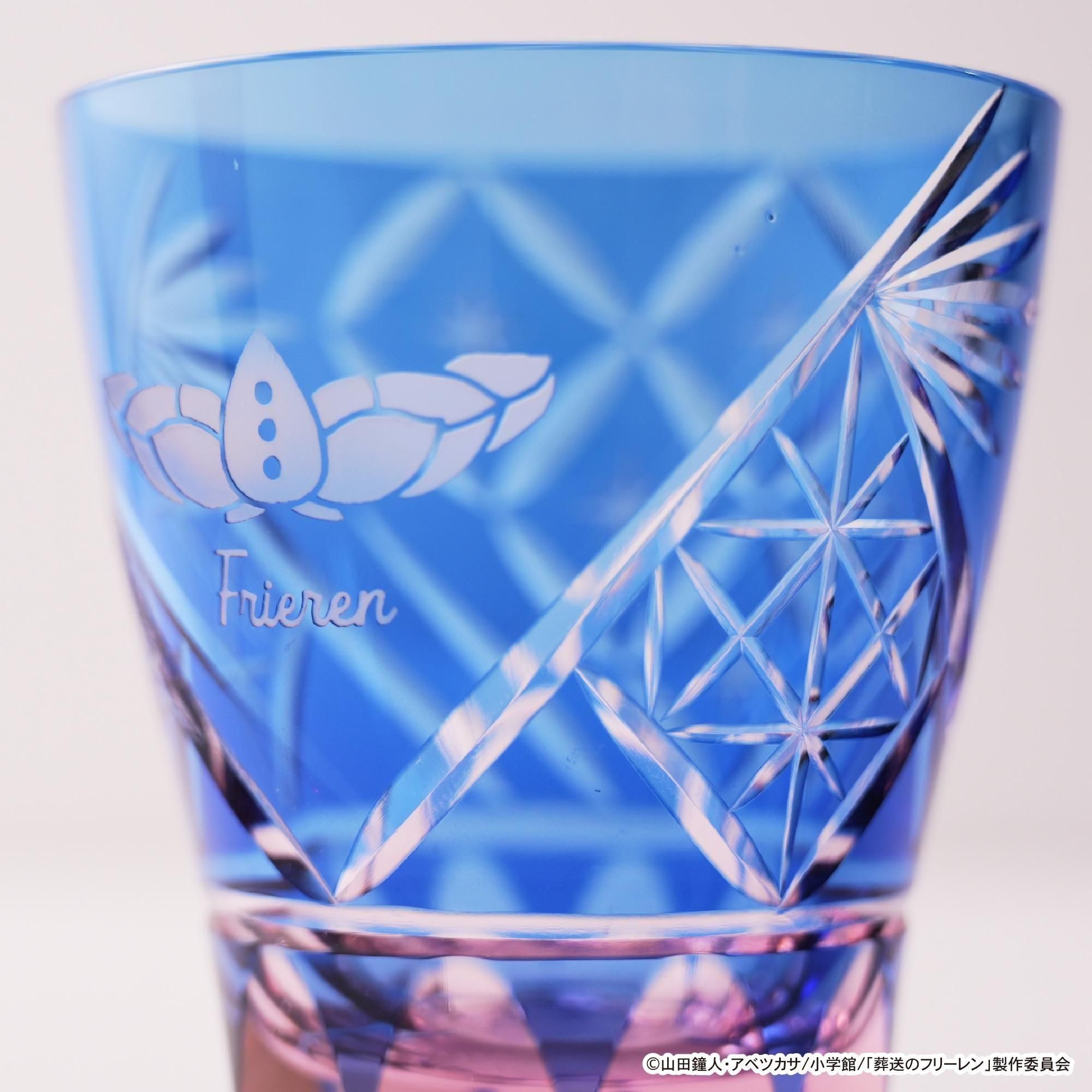 『葬送のフリーレン』の世界観を、江戸切子ならではの繊細なカットで表現しました。青と紫色のグラデーションが施されたグラスは、フリーレンのイメージカラーを表現していて、魔法をイメージしたカットが光を受けてきらめき、グラス底にはサンドブラストで描かれたフリーレンが顔を覗かせています。さらに、正面にはサンドブラスト加工によってヒンメルからの贈り物「鏡蓮華の指輪」をイメージしたシンボルを描き出し、幻想的でありながら凛とした存在感を持たせています。